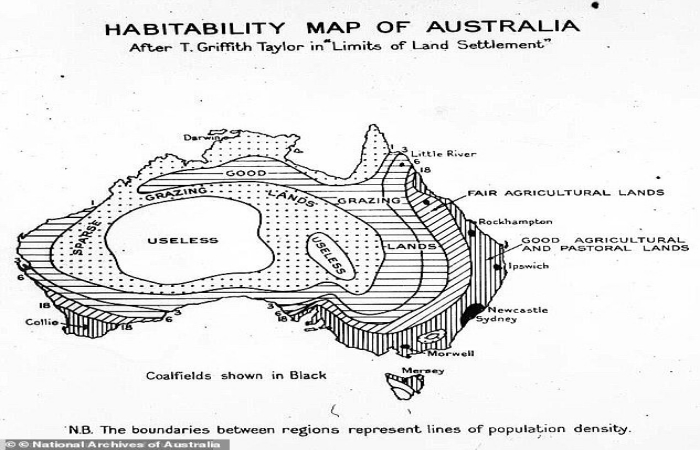 Sydney Üniversitesi’nden Coğrafya Profesörü Griffith Taylor’ın çalışmalarına dayanan haritayla, ülkenin nüfus artışının sınırlarının gösterilmesi amaçlanmış.