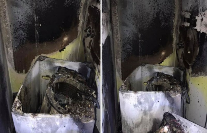 Kadının paylaştığı fotoğraflar arasında makinenin ve duvarların yangından sonraki halleri görülüyor.
