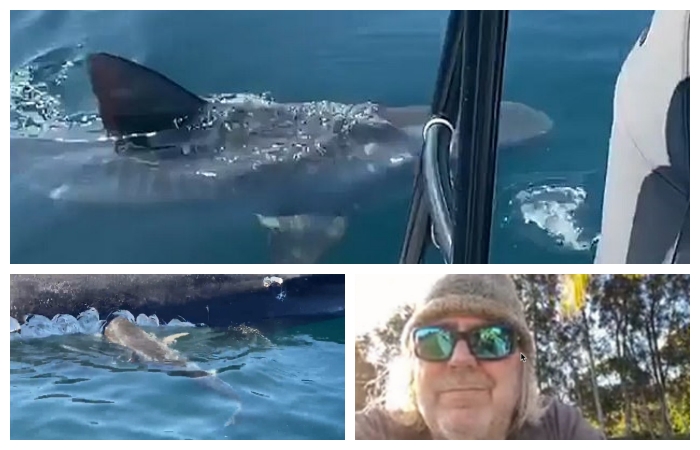 NSW Mid-North Coast’ta bir balıkçı, büyük beyaz köpekbalığının saldırısına uğradı, tekneyi ısıran köpekbalığı bir parçasını kopardı.