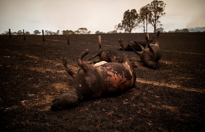 Orman yangınlarda 100,000’den fazla koyun ve sığır öldü, hayvan ölülerinin arz ettiği hastalık ve biyogüvenlik acil durumu karşısında yedek askerlerin toplu mezarlar kazacağı bildirildi.