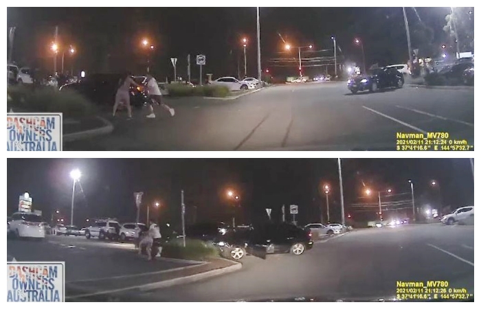 Araç güvenlik kamerası görüntülerinde, Campbellfield’da siyah bir Mazda’nın sürücüsünün bir erkekle kadını ezmek için hızla gittiği, kişilerin aracına korkunç bir şiddetle çarptığı görülüyor.