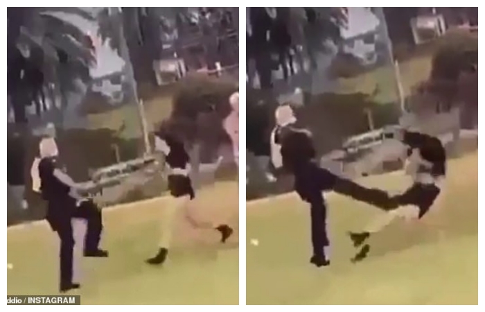 Melbourne’de şok görüntüler: Polise saldırmak isteyen kadın, memurun tekmesiyle uçtu