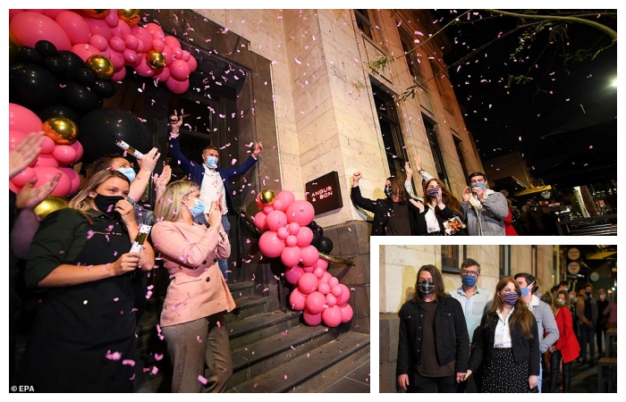 Angus and Bon biftek restoranının sahibi Liam Ganley, “Resmi olarak Melbourne restoranlarının açıldığını ilan ediyorum” sözleriyle kurdele keserek konfetilerle ve alkışlarla kutlama yaptı.