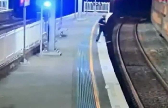Geçen Cuma gecesi Sydney’in iç batısındaki Burwood İstasyonu’nda sarhoş sürücü platformun kenarına doğru yürürken görülüyor.