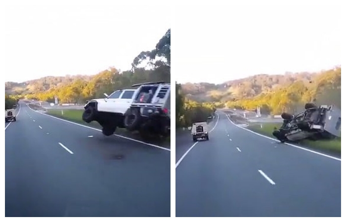 Öndeki aracın sürücüsü kazayı görüp sol şeride geçiyor, kamyonet ise defalarca takla atarak orta refüjü de aşıyor, sağ şeride tekerlekleri üzerine konuyor.