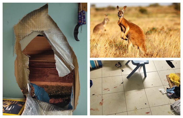 Genç bir kız, bir kangurunun odasının duvarını kağıttanmış gibi delip girmesi ve odayı darmadağın etmesi karşısında şaşırıp kaldı, kızın babası hayvanı süpürgeyle evden çıkarmayı başardı.
