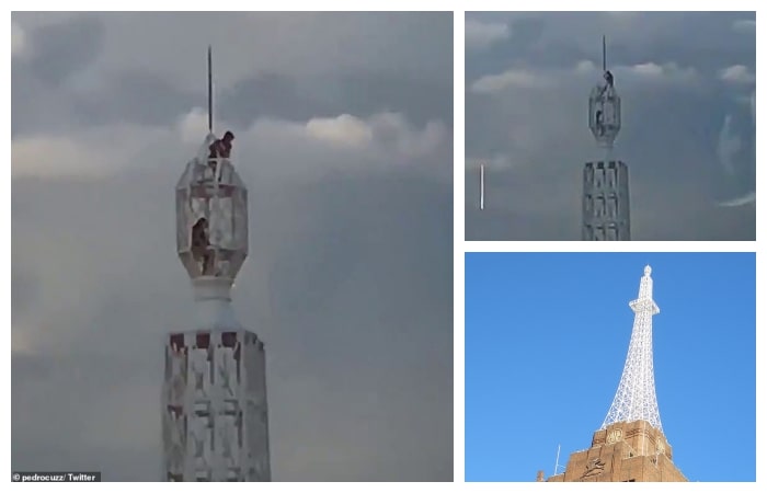 Görüntülerde ölüme meydan okuyan 2 kişinin kulenin tepesine çıktıkları görülüyor.