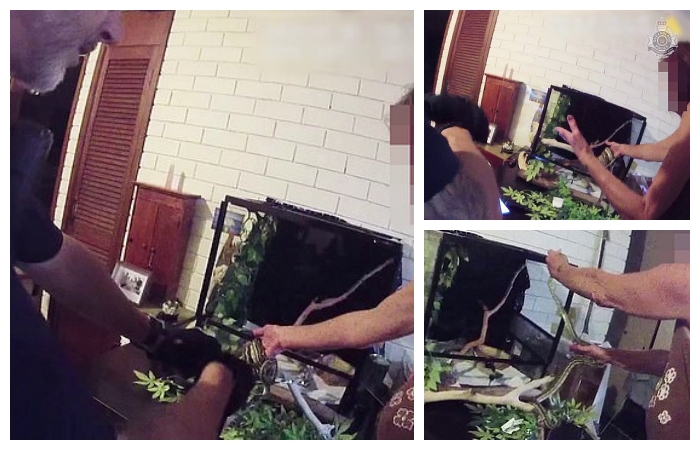 Kadın, memura Monty adlı yılanın dostça olduğu konusunda güvence veriyor, daha önce hiç böyle davranmadığını söylüyor.