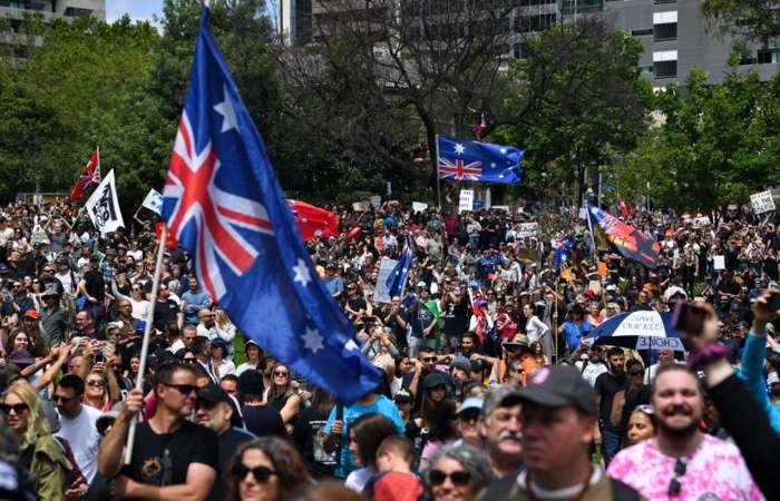 Aşı karşıtları, ülke çapında düzenlenen diğer protestolarla bağlantılı şekilde Melbourne merkezini aşılama talimatlarına tepki göstermek karşı doldurdu. Parlamento binasının çevresindeki…