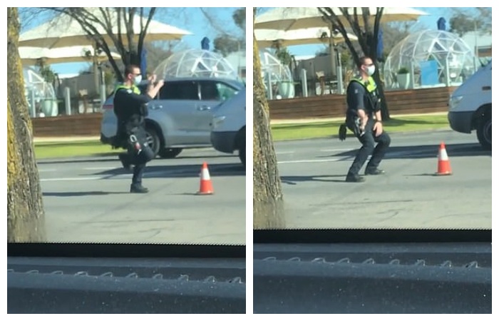 Bugün Reddit’te paylaşılan görüntülerde, sınırdaki Yarrawonga kontrol noktasında geçen araçlara nezaret eden memurun dansı görülüyor.