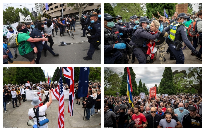 Melbourne’de bugün öğleden sonra tecrit karşıtı protestolarda ortalık karıştı, eylemciler polislere yumruklarla, polis atlarına sopalarla saldırdı, polis biber gazıyla müdahale etti.