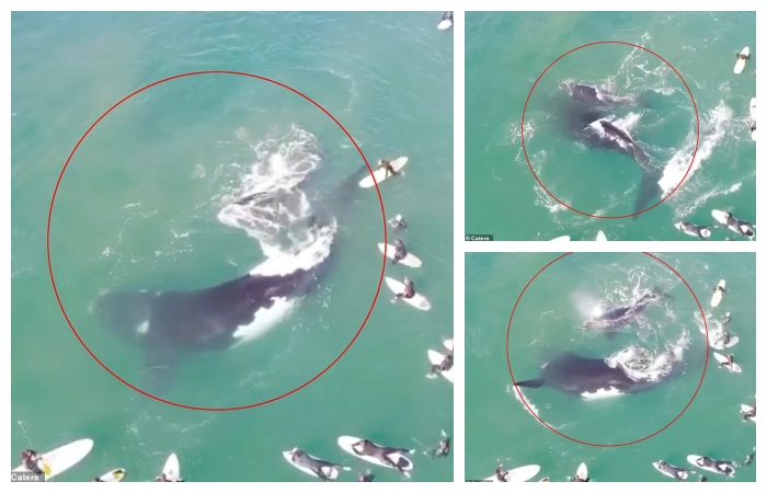 Sydney-Manly Plajı yakınlarında, bir dalgıç, balinanın yavrusuna dokunmaya kalkınca, dev anne balina sörf yapan gruba kuyruğunu savurdu.